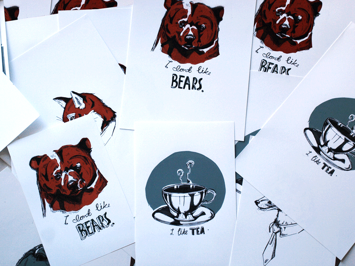 Having witnessed it’s popularity, I thought I’d bring it to life with a little splash of colour and returned to my usual haunt, the print rooms, to create these three sets of limited edition screen prints from the zine.