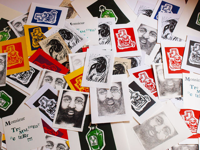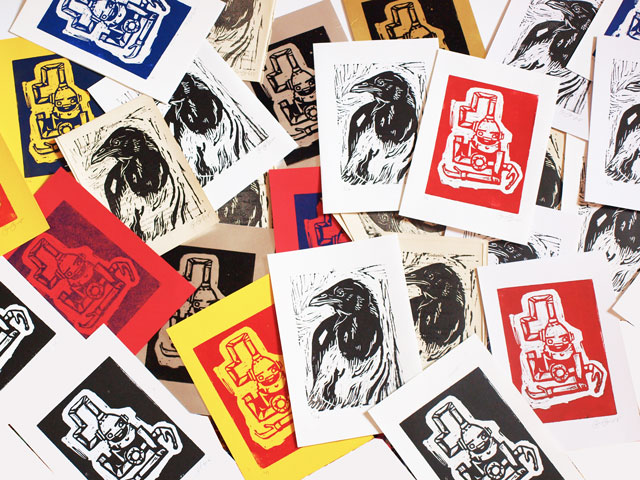 Magpies and Robots! Quick, A6 lino-cuts I made on the last day of Uni before Easter! Printed on a vast array of second hand papers.