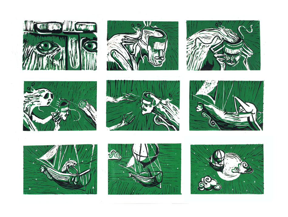 My static image sequence, while still rushed and far from perfect, had the advantage of being a practice I was familiar with. In an attempt to communicate this driving theme of the mask’s wooden texture, I made the (pretty foolish to be honest) decision to linocut my sequence in three colours which, due to the restrictions of the process and size of my lino, added a simple bleakness to the images and lost a lot of potential detail. As I’ve said, just a little too often about my work before, they’re not the greatest feat of printmaking known to man, but time played a restricting factor that forced the simplification of imagery down to the point to see here.