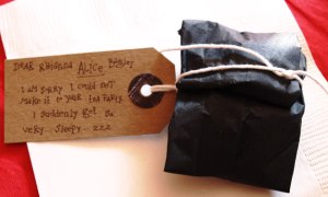 I gave it to her by tying helpful, directional luggage tags (“Follow Me”, “This Way”, “Just a Little Further” etc) to a long length of string that ran all around the house, in and out of doorways, along banisters and finally into the kitchen where the tea party was arranged, and finally into the sugar bowl where it was hidden.